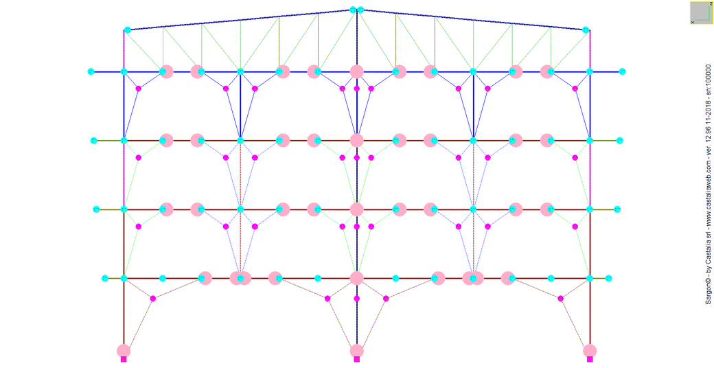 I pallini di colore rosa indicano le zone dissipative (link lunghi e incastri al piede). E’ stata preventivamente eseguita una analisi modale che ha fornito questi periodi e masse partecipanti: