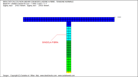 La tensione normale massima e la tensione normale minima sono riportate anche sulla sezione, in corrispondenza dei punti dove si manifestano. Ogni fibra della sezione è campita con un colore dipendente dal livello di tensione. In questo modo è possibile cogliere l'andamento delle tensioni nella sezione, nonché la posizione dell'asse neutro in caso di flessione (retta o deviata). Se una fibra ha tensione normale nulla, essa risulterà bianca.