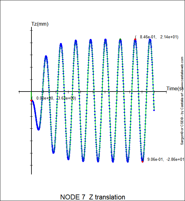 Nel nostro caso la risposta statica è data da F/K= 10.000/1000 = 10 mm. Ne consegue che dovremmo trovare oscillazioni forzate, passato il transitorio, con ampiezza 25 mm. Il periodo di tali oscillazioni forzate coincide con il periodo della forzante. Eseguita la analisi dinamica non lineare, avendo però impostato un comportamento lineare, con dT=0.001 sec e ΔT=1sec, si ottiene per lo spostamento nel nodo iniziale la seguente curva funzione del tempo: