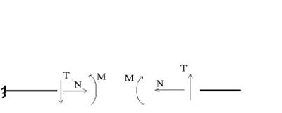 Abbiamo detto che l’azione del vincolo a terra può essere assimilata alla applicazione delle reazioni vincolari nel punto ove il vincolo agisce. E’ intuitivo che la struttura faccia in qualche modo da tramite tra il carico applicato ed il vincolo, cosicchè anche essa si venga a trovare coinvolta nel compito di “portare” il carico applicato. Per capire come, osserviamo che considerato un generico punto distante “x” dall’estremo caricato, in quel punto si può immaginare siano saldati due pezzi dell’asta in oggetto: quello cha va dal carico al punto e quello che va dal punto al vincolo. Due pezzi saldati equivalgono a due pezzi incastrati tra loro. Abbiamo già imparato che ai vincoli si possono sostituire le loro reazioni, pur di calcolare queste ultime in modo da rispettare l’equilibrio. Non dobbiamo fare altro che ricordare il principio di azione e reazione, che sancisce che quando un corpo esercita su un altro una certa azione, quest’altro esercita sul primo una reazione eguale in modulo e contraria in verso. Possiamo dunque tagliare l’asta nel punto che dista x (un punto assolutamente generico) dall’estremo libro pur di: