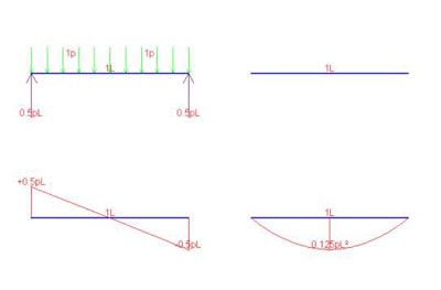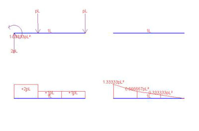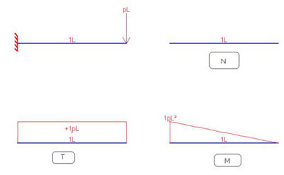 I diagrammi sono molto utili ed amplissimamente usati nella pratica, poiché ci dicono come variano le azioni interne lungo l’asta, facendo vedere le sezioni dell’asta più sollecitate. In questo esempio è chiaro che la sezione più sollecitata è proprio quella dell’incastro, poiché il taglio e ovunque eguale, mentre il momento flettente cresce linearmente all’avvicinarsi all’incastro (M=pLx). Vediamo un secondo esempio.