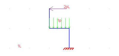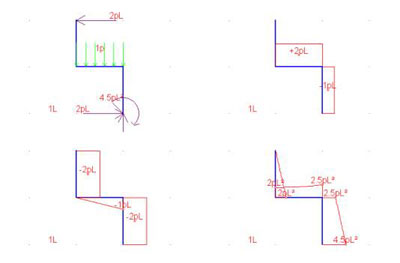 Infine si osservi che la concavità del diagramma di momento è diretta verso l’alto, in verso opposto al segno del carico distribuito, diretto verso il basso (come previsto dalla (3)). Sebbene l’uso del sistema di rompere l’asta evidenziando le azioni interne, per poi scrivere le equazioni di equilibrio in funzione di “x” e dei carichi attivi e reattivi applicati, sebbene questo metodo sia corretto, questo è un metodo abbastanza lungo, e pochi lo seguono nella pratica. Un corretto apprendimento delle regole enunciate ed un po’ di senso fisico (quando un’asta è tesa?) bastano spesso a risolvere il problema. Vediamo la seguente sedia, e proviamo a calcolarne i diagrammi con questo altro metodo (ogni tratto è lungo L). Si richiede uno sforzo di concentrazione.