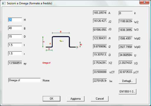 Questo dialogo consente di definire le quote di una sezione ad Ω (formata a freddo) e di studiarne le proprietà.