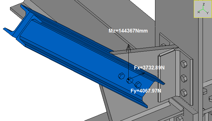 Nell’esempio della figura sottostante sono selezionate una membratura e la bullonatura ad essa connessa: vengono visualizzate solo le forze consegnate dalla piastra alla bullonatura; se si deselezionasse la membratura verrebbero mostrate anche le forze scambiate tra questa e la bullonatura, come agenti sulla bullonatura. Per avere le forze causate dalla bullonatura sulla membratura basta selezionare solo la membratura. Se si seleziona solo la piastra si hanno le forze agenti su questa a causa della presenza della bullonatura e delle saldature.