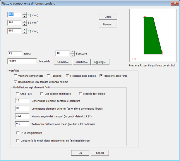 •Si può inoltre richiedere la creazione di un modello FEM della piastra stessa a valle delle verifiche, per studiare nel dettaglio sforzi e deformazioni attraverso un modello plate-shell ed il passo massimo che la mesh deve avere, ovvero la lunghezza massima del lato di ciascun elemento. La dimensione della mesh deve essere specificata nella unità di misura attiva. I fori dei bulloni possono essere esplicitamente modellati, o no.