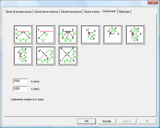 In questo dialogo é possibile scegliere uno dei nodi con controventi disponibili. Cliccando sullo schema desiderato, si passa al dialogo in cui verranno definite le proprietà delle membrature.