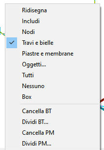 7.In assenza di comandi in corso, il tasto destro del mouse dà accesso a un menu a tendina che consente di scegliere se selezionare Nodi, Travi o Bielle o Piastre e Membrane, senza passare per il comando "Oggetti da Selezionare".