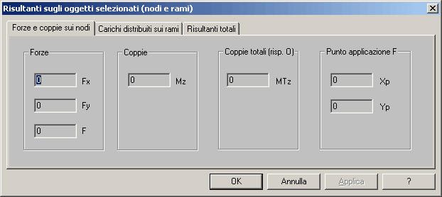 Questo dialogo serve a listare le risultanti delle forze e coppie applicate sui nodi selezionati (e in questo caso ha il nome “Forze e coppie sui nodi”); le risultanti dei carichi distribuiti applicati ai rami selezionati (e in questo caso ha il nome “Carichi distribuiti sui rami”); le risultanti complessive sui nodi ed i rami selezionati (ed in questo caso ha il nome “Risultanti totali”).