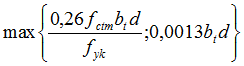 Nella determinazione della area minima il programma tiene anche in conto le limitazioni sulla percentuale di armatura (minima e massima), che in generale variano in funzione del tipo di elemento costruttivo e della norma. Nella seguente tabella, relativa al quantitativo minimo di acciaio, d è l’altezza utile, bt è la larghezza media della zona tesa, fyk è la tensione di snervamento caratteristica e fctm è la resistenza a trazione media del calcestruzzo