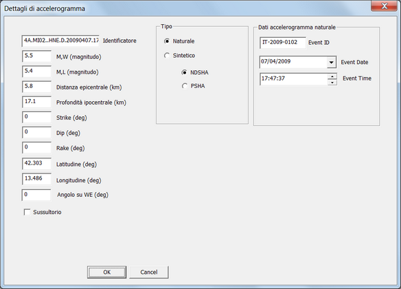 Questo dialogo serve a dare i dettagli associati a un segnale (naturale o sintetico). I dati sono vicini a quelli specificati nel formato ASC relativo ai segnali naturali scaricabili dal sito INGV. Angolo su WE dice la direzione del segnale se orizzontale. L'angolo in gradi è positivo se antiorario, e quindi 90 implica una direzione Nord. Questo dato è molto importante quando poi si dovrà calcolare il segnale nelle direzioni X e Y della struttura. Infatti, gli accelerogrammi vengono letti con direzioni (componenti) in generale non allineate con l'asse X e Y della struttura. E' quindi necessario (per qualsiasi operazione che riguardi la struttura) convertirli all'asse X e Y della struttura. Ma per fare questo occorre sapere l'orientamento assoluto dei segnali letti, rispetto all'asse geografico che va da Ovest a Est. Se il segnale si riferisce alla direzione Z allora il flag "sussultorio" è marcato. Sono previsti segnali naturali, o sintetici. Questi ultimi NDSHA o PSHA. Un segnale sintetico è un segnale comunque ottenuto per modifica o filtraggio di segnali naturali (PSHA), ovvero un segnale interamente generato per mezzo di simulazioni fisiche (NDSHA). Segnali NDSHA possono essere ottenuti presso www.xeris.it . |