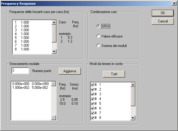 Questo dialogo consente di impostare il funzionamento del solutore per l’analisi di risposta in frequenza. Nel riquadro in alto a sinistra “Frequenza delle forzanti caso per caso (hz)” vengono stabiliti i valori di frequenza delle forzanti caso per caso a partire dal primo. Se il numero di casi di carico è maggiore di 1 l’ultimo caso di carico non compare, essendo riservato alla combinazione degli effetti. Nel riquadro in basso a sinistra (Smorzamento modale) vengono definiti i punti che individuano la curva che dà lo smorzamento in funzione della frequenza. Se il numero di punti cambia occorre specificare il nuovo valore e poi premere il tasto Aggiorna. Per ogni punto occorre fornire prima la frequenza (in hertz) eppoi lo smorzamento relativo al critico. Nel riquadro in basso a sinistra (Modi da tenere in conto) si selezionano o deselezionano i modi a seconda che si desideri o meno tenerne conto nei calcoli. Il pulsante Tutti consente di specificare che si vogliono tenere in conto tutti i modi, nessuno escluso. Il riquadro in alto a destra (Combinazione Casi) consente di specificare il metodo da impiegare per combinare gli effetti di diversi insieme di forze agenti a frequenze differenti. Sono possibili tre sistemi: SRSS (radice quadrata della somma dei quadrati), valore efficace e somma dei moduli.
