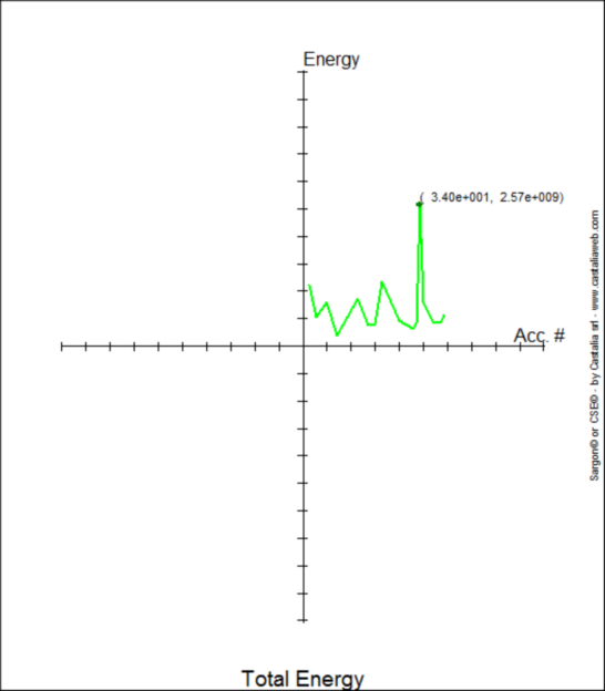 Come si vede, è possibile considerare solo alcuni segnali e non altri, e solo alcuni modi e non altri (per scartare, ad esempio, i modi spurii, o per eseminare gli effetti dei soli modi superiori al dominante, ecc.). In questi primi esempi saranno considerati tutti i segnali e tutti i modi. Lo smorzamento modale è dato per mezzo di una curva. In questi esempi è tenuto costante e pari al 5% dello smorzamento critico. Al momento in cui si scrive non è ancora stata implementata la possibilità di considerare terne di accelerogrammi agenti contemporaneamente: tale opzione sarà aggiunta a breve, anche considerando la direzione dell’asse X della struttura posto sui 4 punti cardinali. Si fa dapprima la prova considerando tutti gli elementi (“Solo gli elementi selezionati” non ha la spunta), e considerando i segnali applicati alla sola direzione X. Il tempo di calcolo è di una manciata di secondi (circa 10 sec o meno, 50 modi estratti tutti considerati, 50 segnali da 1000 punti, il numero di gradi di libertà del modello è 2056). Il fatto che i tempi siano così brevi implica che EDEM è fattibile anche con molti segnali ed è uno strumento rapido ed efficiente. I risultati sono presentati come collezione di curve, ognuna delle quali ha un certo significato. Di particolare importanza è la curva che dice qual è il massimo di energia incassato considerando la time history modale (THLM) della struttura assoggettata a ciascun segnale, in funzione del numero di segnale. La curva detta “Total Energy”, si presenta come segue: