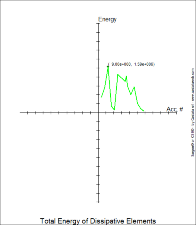 EDEM come funzione del segnale. Tutti gli elementi considerati. Segnale peggiore numero 41. Periodo del 41° segnale = 41x0.04=1.64 sec, quasi in risonanza con il modo 3, importante per segnali X. Massima energia incassata nella struttura 7.65 1010 mJ=76.5 MJ. Se si considerano tutti gli elementi trave e biella della struttura, l’energia totale incassata raggiunge 12.3MJ. Una seconda molto interessante curva, è quella che considera solo gli elementi dissipativi, ed in particolare modo la sola energia che in campo non lineare è associata alla deformazione plastica attesa e per la quale si progetta la dissipazione. In questo caso è la flessione sull’asse principale forte degli elementi con pallino rosa (zone dissipative). Se si considerano solo questi elementi, che sono quelli che contano per contrastare il sisma, si ha la seguente curva (“Total Energy of dissipative elements”).