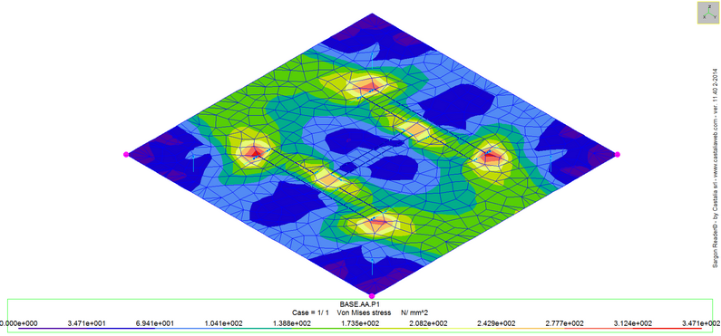 2.Viene letto il massimo valore σVM di tensione di Von Mises non regolarizzata nel modello e questo viene rapportato alla tensione di snervamento fy (eventualmente ridotta a seconda della norma, vedasi più avanti) del materiale di cui è costituito il pezzo, dando luogo ad uno sfruttamento E per ogni combinazione di verifica.