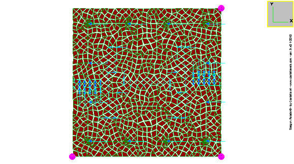 I modelli FEM di A e di B risultano molto diversi, particolarmente nelle zone più vicine ai bordi. Con riferimento alle figure sottostanti, che mostrano il dettaglio della zona vicina a uno spigolo, si nota infatti che nel modello B ci sono nodi molto più vicini e di conseguenza elementi plate-shell molto più piccoli, che sono più fitti vicino ai bordi e si diradano allontanandosi da questi. Il modello A è invece più regolare e omogeneo.