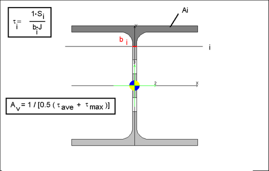 | La tensione tangenziale "di calcolo" è posta eguale al valor medio tra τave e τmax, ammettendo quindi una parziale redistribuzione. Infine, il modulo di resistenza a taglio Av,v è posto eguale al reciproco della tensione tangenziale "di calcolo" (il taglio è eguale a 1): |