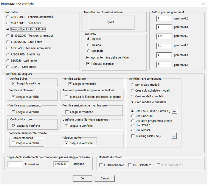 Scelta della lingua del tabulato di output (italiano, inglese o spagnolo), opzione di apertura automatica dello stesso al termine delle verifiche e opzione di inclusione nel tabulato dei risultati delle verifiche. Se non si includono i risultati, il tabulato conterrà solo la descrizione del modello ed eventualmente le combinazioni considerate, in caso di selezione automatica delle combinazioni peggiori tra tutte quelle importate; in modelli molto complessi e con numerose istanze e centinaia o migliaia di combinazioni, la scrittura dei risultati nel tabulato può richiedere un certo tempo.