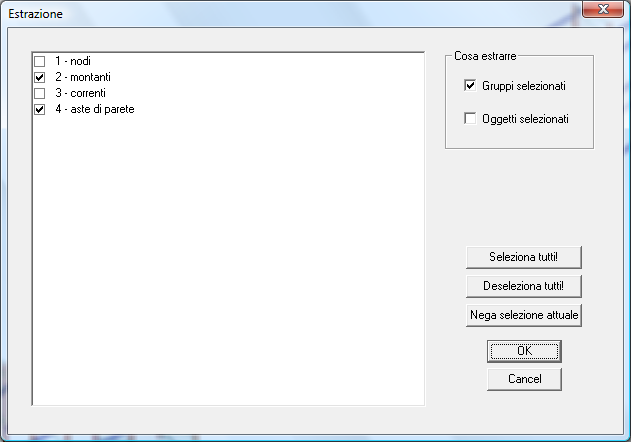 E’ possibile estrarre tutti gli oggetti appartenenti ai gruppi spuntati (nella lista a sinistra in figura) e/o tutti gli oggetti selezionati al momento dell’esecuzione del comando.
