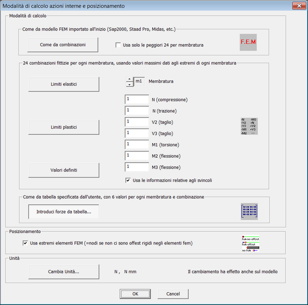 Usa le informazioni relative agli svincoli: se si spunta questa opzione, le azione interne che nel modello FEM non vengono trasmesse per la presenza di svincoli non vengono considerate (ad esempio i momenti se c’è una cerniera): rimane una combinazione nulla per mantenere lo stesso ordine tra le combinazioni di una membratura. Se si usa questa opzione con i limiti elastici, nel tabulato verranno riportate le rigidezze relative delle varie membrature.