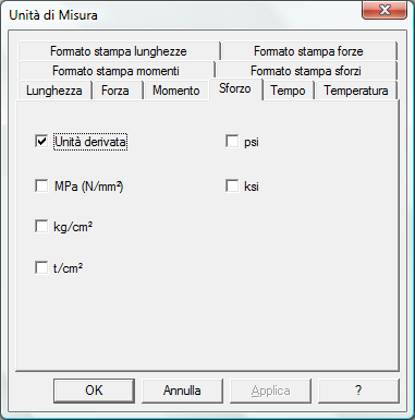 Con questo dialogo si sceglie l'unità di misura corrente per gli sforzi. L'unità può essere fissa (MPa, kg/cm2, psi, etc.) oppure automaticamente derivata dalle unità correnti per la lunghezza e per la forza.