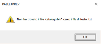 Questi file consentono un editing con qualsiasi editor di testo. Alla prima esecuzione di palletprev, esso cerca nella cartella ove risiede palletprev.exe il file "catalogo.bin" che è un file binario che contiene tutti i dati dei file TXT.